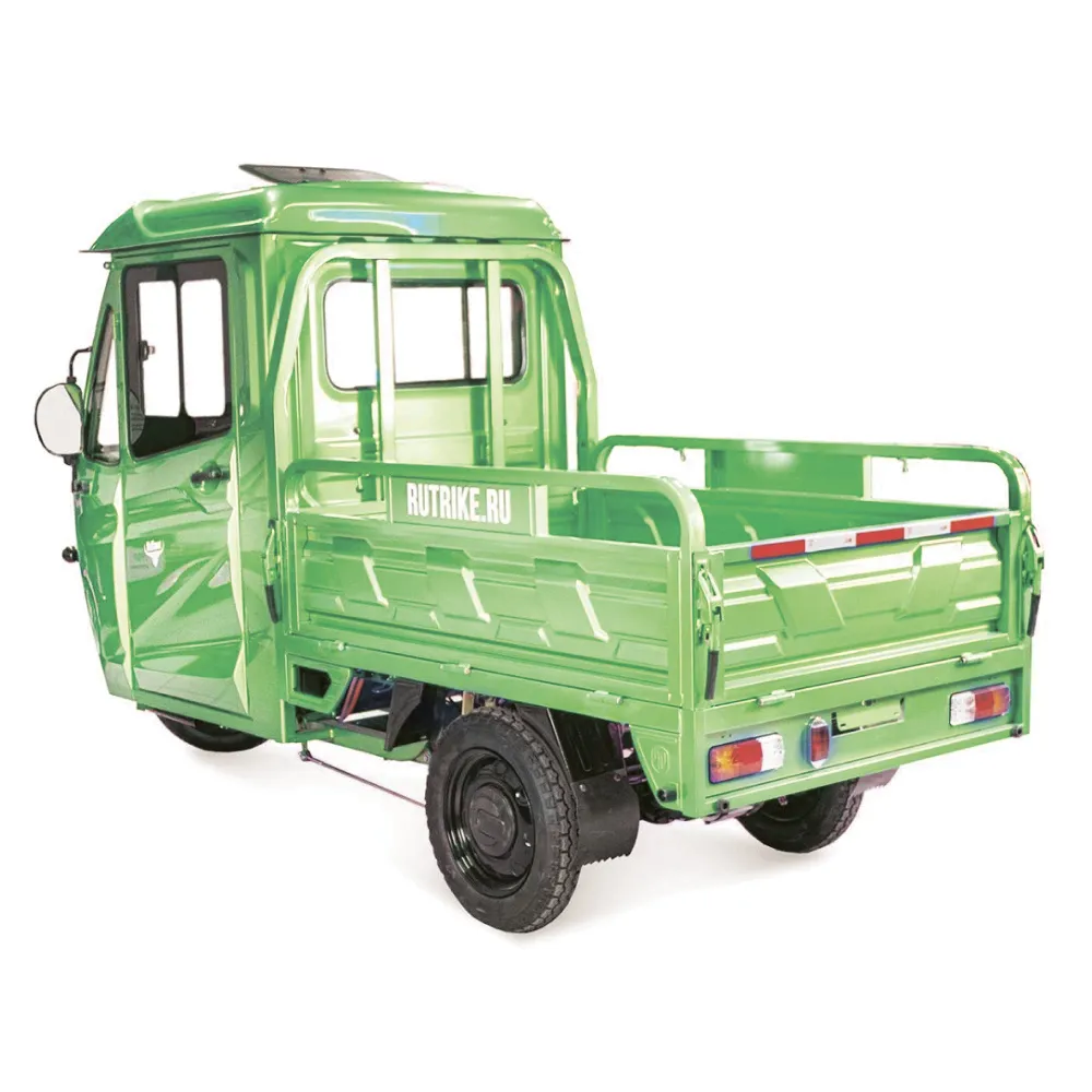 Модель оснащена современным тяговым бесщеточным новым мощным мотором с параметрами 1000 Вт. Такая начинка улучшает скоростные характеристики техники. Электротрицикл быстро развивает скорость до 25 км/час. Откидные борта кузова позволяют легко выгружать крупногабаритный груз. Герметично закрытая кабина допускает езду при любых погодных условиях, открывается с двух сторон.