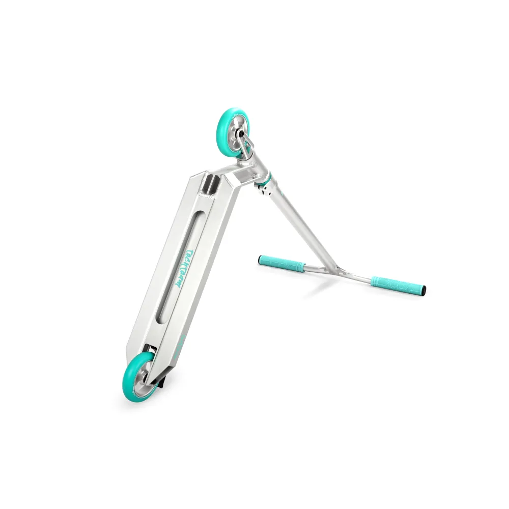 Этот трюковый самокат создан для профессиональной езды в парке. Скоростные колёса диаметром 110 мм, выполнены из алюминия, придают самокату максимальную скорость. Манёвренность и хороший отскок самоката обеспечивает покрытие колёс из полиуретана 88А, имеющих ширину 26 мм. У самоката имеются высококачественные подшипниками АВЕС 9, придающие самокату хороший накат.